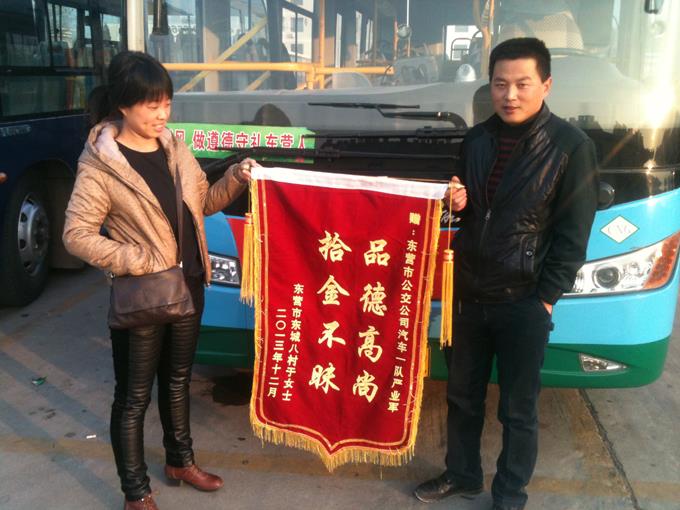 2013年12月5日,東城八村乘客于小梅女士拿著一面寫有“拾金不昧、品德高尚”的錦旗來到市公交公司汽車一隊,感謝車隊嚴業軍師傅拾金不昧的高尚品德。