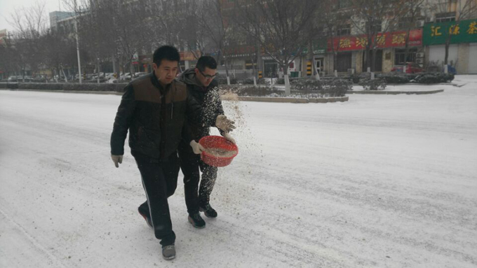 公交站點傾灑融雪劑 保障公交車出行順暢