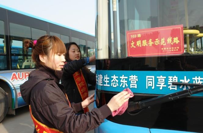 來自東營市職業(yè)學(xué)院經(jīng)濟系的大學(xué)生和汽車一隊職工共計30余人,分成六個小組,上午幫助駕駛員擦拭車身,打掃車廂,下午乘坐公交車為特需乘客服務(wù)。