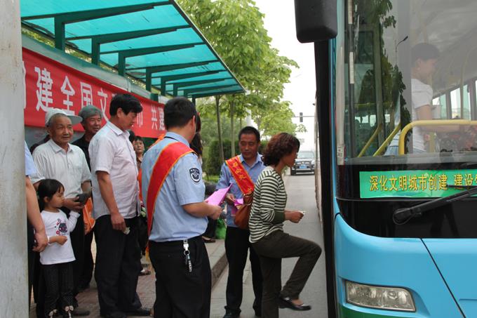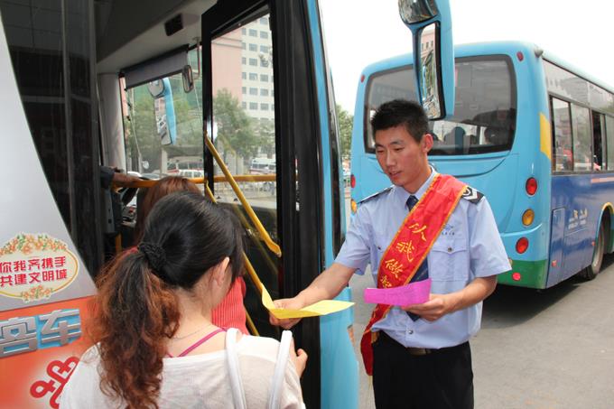 “文明乘車,從我做起” 文明勸導活動由市公交公司創(chuàng)城活動領導小組統(tǒng)一安排部署執(zhí)行,公司領導班子和各車隊隊長親臨上陣,投入到活動中。本次活動市公交公司共制作創(chuàng)城宣傳橫幅7幅,印制“文明乘車,從我做起”倡議書2000余份,綬帶14條?;顒拥拈_展有效地規(guī)范了公交車輛進出站秩序,整治了公交站點環(huán)境衛(wèi)生,增強了市民“有序乘車,文明禮讓”的乘車意識,為全市“五城聯(lián)動”創(chuàng)建工作做出了積極的貢獻。